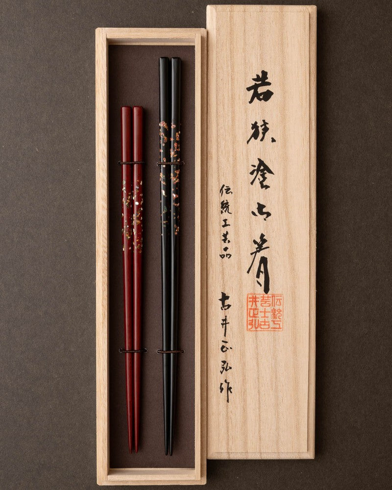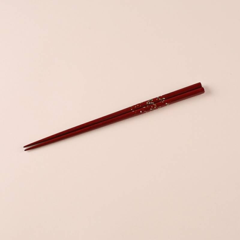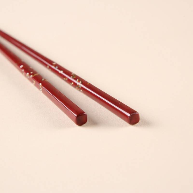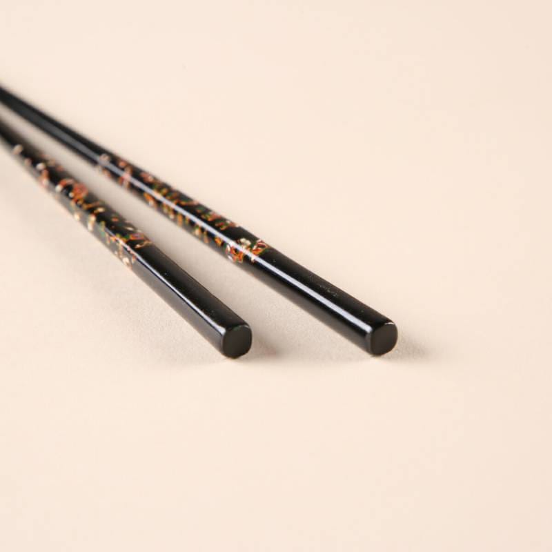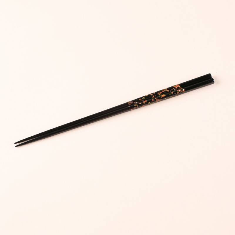 "Junkin Wakasa" features a pattern only on the handle. It has a refined beauty that is by no means flashy. The shells and gold leaf sparkling among the simply painted chopsticks make them look like the night sky or the ocean. These chopsticks are not too flashy and are perfect for wedding gifts, or for anyone who gives them to someone else. They are slightly slender